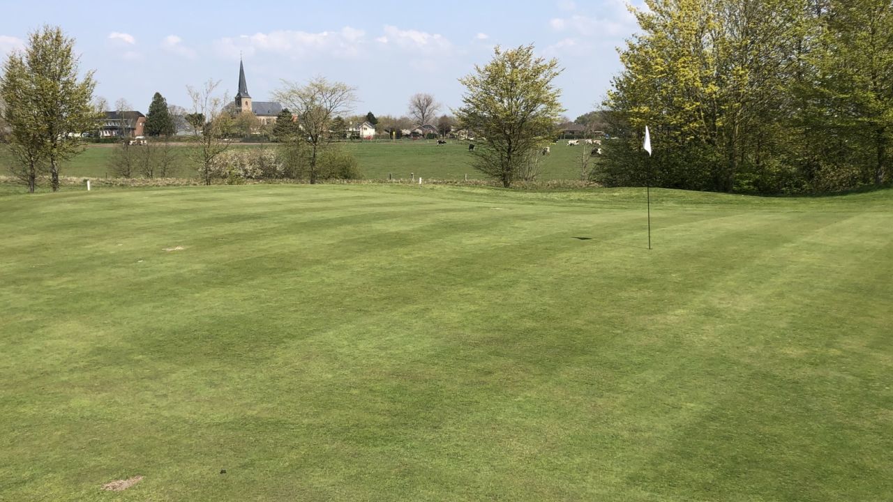 Golfen in schöner Natur - nette Montagsrunde im GC International Moyland . 3 Blicke auf der Bahn 14 , schönes Par 4